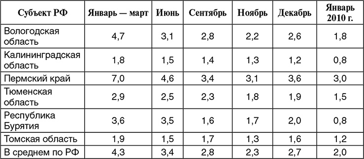 Рост реальных доходов населения сохранился в менее развитых республиках и некоторых регионах Дальнего Востока. Они слабее затронуты кризисом, при этом получают большие федеральные трансферты, обеспечивающие стабильность выплат, заработной платы многочисленным бюджетникам и социальных пособий. Именно по этим причинам в Бурятии доходы населения не сократились. Из тренда выбиваются только реальные доходы населения Калининградской области. Их сохранение на уровне 2008 г. не выглядит достоверным, так как рост номинальной заработной платы на 7 % не покрывал инфляцию, а рост социальных выплат населению из бюджета области был ниже среднего по РФ (соответственно на 17 и 29 %).