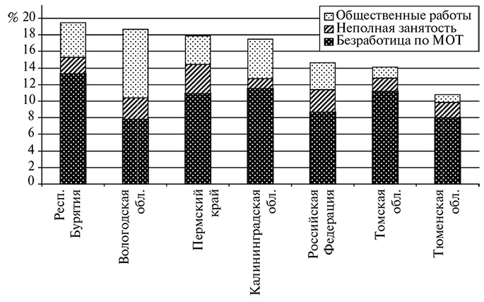 Реальные масштабы проблемы занятости в регионах можно оценить при суммировании открытых и скрытых форм безработицы, включая общественные работы (организованные в рамках дополнительных мероприятий, снижающих напряженность на рынке труда). Для занятости на общественных работах не существует помесячных измерений (учет ведется нарастающим итогом в течение года), поэтому ее уровень может быть завышенным. Кроме того, некоторые регионы увеличивают занятость на общественных работах для получения большего объема федеральных трансфертов, например Татарстан. Тем не менее суммарный рейтинг пилотных регионов вполне адекватен (рис. 1.3). В Вологодской области показатели открытой безработицы резко занижены с помощью общественных работ. В Калининградской области этот механизм начали использовать только с середины 2009 г., но весьма интенсивно. В Пермском крае выше вклад неполной занятости. При совокупной оценке открытых и скрытых форм безработицы, включая общественные работы, выделяются три региона с наиболее существенным ее ростом в кризисный период Вологодская, Калининградская области и Пермский край.