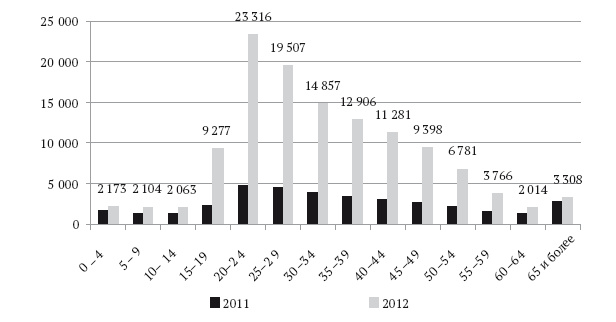 Рис. 3. Количество мужчин и женщин в указанных возрастных категориях, выехавших из РФ за рубеж в 2011 и 2012 гг.