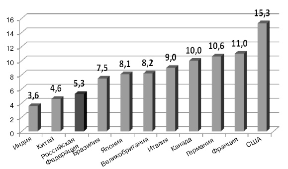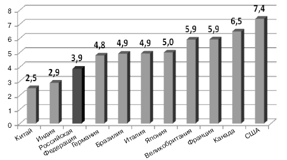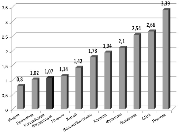 По данным ОЭСР[29], средние расходы на исследования и разработки в 2006 г. в странах G8 и БРИК составили 1,8 % ВВП (рис. 10).