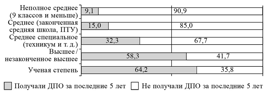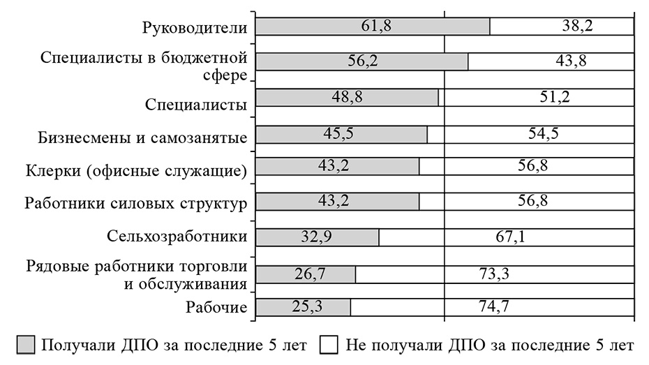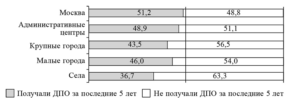 Надо отметить, что размер и тип поселения в меньшей степени, чем уровень образования, влияют на включенность россиян в систему дополнительного образования. Так, даже в сельских поселениях свыше трети работающего населения за последние пять лет повышали свой профессиональный уровень. В городах, особенно административных центрах субъектов Российской Федерации, включая Москву, данный показатель самый высокий около 50 % (рис. 3). Тем не менее разрыв между Москвой и селами по доле получавших ДПО не очень велик и составляет всего 14,5 % это намного меньше, чем разрыв в 55,1 % между полярными по уровню их образования группами. Таким образом, для активности в сфере ДПО сейчас не так важно, где живет человек, как то, каков его исходный образовательный уровень.