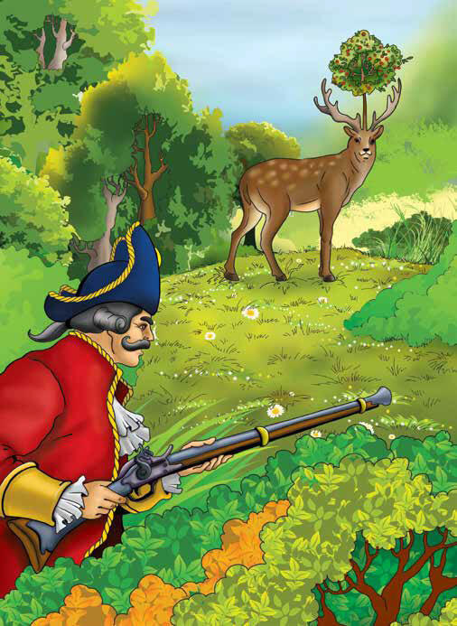 Одного разу, коли я на полюванні вже вистріляв усі свої набої, враз переді мною наче вигулькнув із-під землі чудовий олень. Стоїть і дивиться на мене, ще й так сміливо, ніби знає, що мені нічим у нього стріляти. Та хіба я міг проґавити таку здобич?! Отож, я зарядив хутенько рушницю порохом, a замість шроту досипав до нього жменю вишневих кісточок, швидкома зірвавши з дерева, що росло поруч, і зївши кілька ягід. Цим зарядом я вистрілив у оленя і вцілив йому просто в маківку між рогами. На якусь мить приголомшений звір похитнувся і впав, одначе враз схопився на ноги і гайнув щодуху поміж хащі.