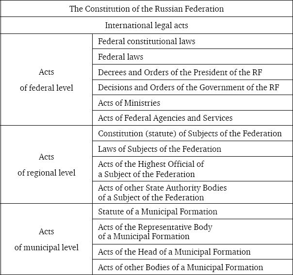 The system of legislation of the Russian Federation consists of three levels: federal, regional (at the level of subjects of the Federation), and local (at the level of municipal entities). At the top of the pyramid of normative acts is the Constitution of the Russian Federation. Moreover, the Russian Federation is a party to several binding international treaties.