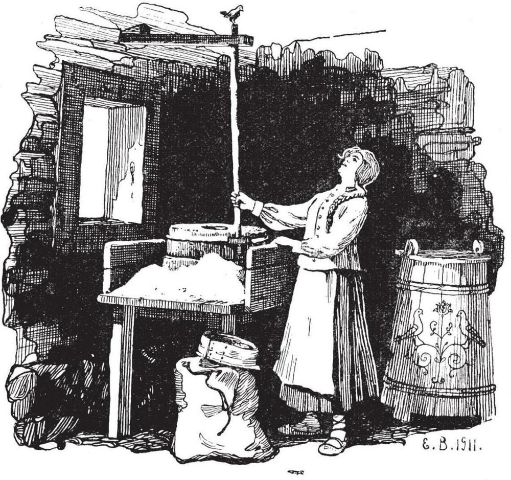 Reiz viena vīramāte iedevusi vedeklai mazu vācelīti rudzu: lai rīta agrumā gaiļos sākot malt un lai maļot, kamēr samalts! Vedekla domājusi: kas nu no tik mazas vācelītes ko malt vēl netikšot pus acī (dzirnavu acī ieberamā caurumā) ko iebērt un, ja reizes trīs apgriezīšot, vairāk nevajadzēšot; bet nekā: piecēlusies gaiļos, malusi, malusi jau liela gaisma, jau dzirnavu galds ar lielu miltu kaudzi pilns bet vācelītē kā rudzi bijuši, tā vēl ir.