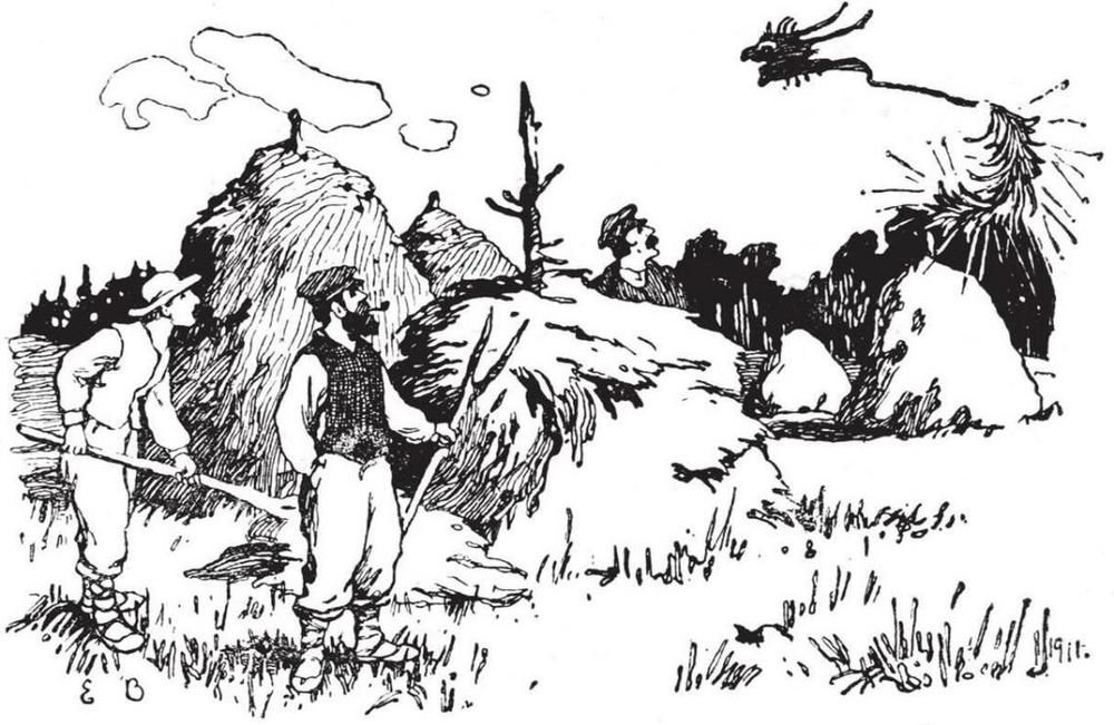 Citā reizē atkal vīri metuši labības stirpu. Te paskatās: pūķis drāž iešņākdamies metējiem pār galvām. Pūķim galva izskatījusies melna, pats vidus bijis tievs, bet brūnā aste bijuse kupla, un tā sprēgājuse vēl tīri kā egles malka.