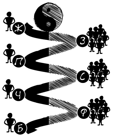 Інакше кажучи, по черзі переважують одна одну дві протилежні тенденції: диференціація від інших (виокремлення себе з групи, зосередження уваги всередину) та інтеграція з іншими (єднання з групою, зосередження уваги назовні). Докладніше про це див. розділ «Соціальні ліфти і соціальні звязки».