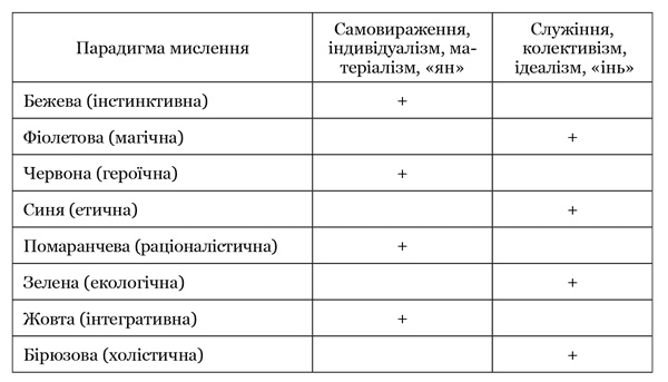 У нижченаведеній таблиці зверніть увагу на метафори парадигм, які можна використовувати паралельно кольоровим позначенням: інстинктивна, магічна, героїчна, етична тощо.