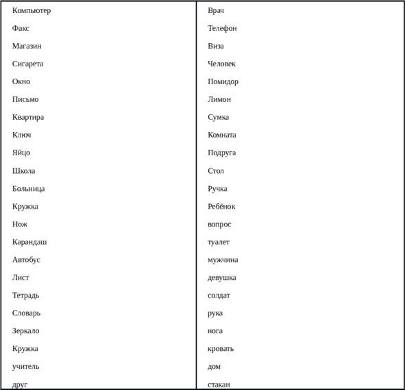 Сестра, брат, машина, скайп, интернет, компьютер, телевизор, собака, окно, молоко, паспорт, виза, кошка, ручка, туалет, пиво, Япония, Китай, Россия, университет.