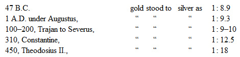 As gold had become the sole legal tender, this change of ratio represents a diminution, during the existence of the Western Empire, of at least fifty per cent in the value of property in relation to debt, leaving altogether out of view the appreciation of silver itself, which was so considerable that the government was unable to maintain the denarius.40