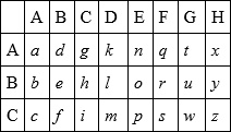 Now suppose that I want to write England; I look among the small letters in the foregoing table for e, and find that it is in a horizontal line with B, and vertical line with B, so I write down BB; n is in line with A and E, so I put AE; continue this, and England will be represented by Bbaeacbdaaaeab. Two letters to represent one is not over-tedious: but the scheme devised by Lord Bacon is clumsy enough. He represented every letter by permutations of a and b; for instance,
