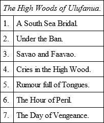 It is very strange, very extravagant, I daresay; but its varied, and picturesque, and has a pretty love affair, and ends well. Ulufanua is a lovely Samoan word, ulu=grove; fanua=land; grove-land the tops of the high trees. Savao, sacred to the wood, and Faavao, wood-ways, are the names of two of the characters, Ulufanua the name of the supposed island.