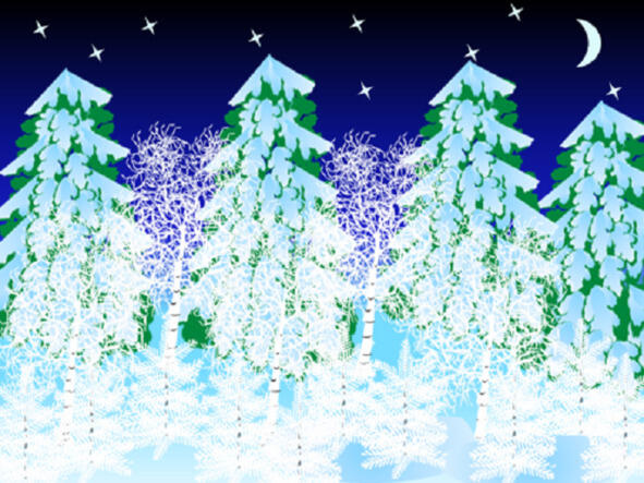 Перед изумлёнными детьми предстаёт зимний лес. Огромные сосны-великаны поднимаются к облакам. Ёлочки стоят под ними, расправив иголочки, которые кажутся белыми, так как иней укрыл каждую веточку. Нежные берёзки переплетаются кудрявыми ветвями, словно намереваясь встать в хоровод вокруг лесных великанов.