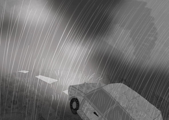 Ураган-хулиган набирал силу. Дождь уже не лил и не строчил. Он обрушился на непослушных сплошной тяжёлой стеной. Стена с рыком и всхлипами бросалась на всё живое, и всё живое вмиг теряло цвет, размер, форму и исчезало. Царствовала серая рыдающая мгла.