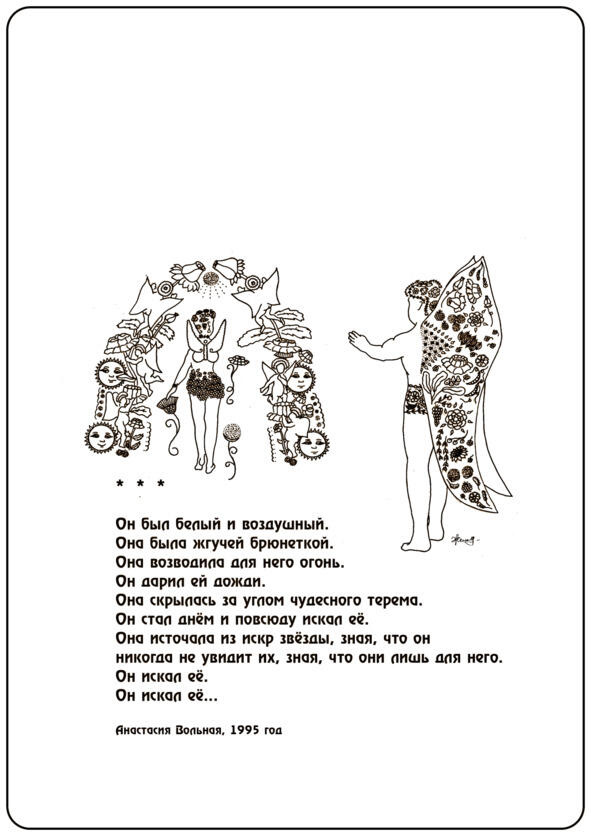 Представленные стихотворения и эссе относятся, в основном, к раннему периоду творческого становления московского поэта и прозаика Анастасии Вольной. В них еще ощущается детская непосредственность, категоричность суждений, наивность, но уже появляется собственный стиль, который будет отшлифовываться и отчетливо проявляться в ближайшем будующем, формируя настоящего поэта.