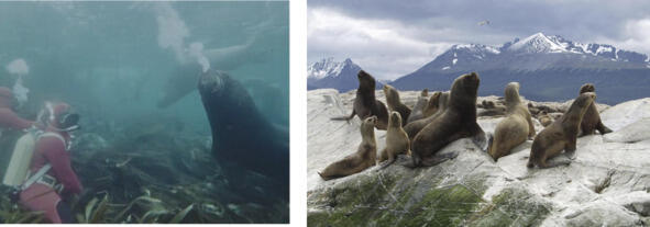 Аквалангисты погружаются в воду среди длинных стеблей водорослей и направляются к морским котикам. К нашему удивлению они отвечают нам взаимностью: они спешат к нам навстречу им интересно взглянуть на аквалангистов! На суше котики чувствуют себя неуклюжими, неповоротливыми и всегда настороже. В море же они в мгновение ока из жалких щенков-увальней превращаются в больших, умных, ловких, быстрых и гибких рыб.