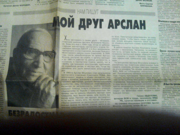 В прошлом году друзья и родные отмечали 85-летие со дня рождения ветерана, отличника милиции Арслана Юсуповича Юсупова. В 1939 году после демобилизации из армии он поступил на службу в органы милиции города Карши и до 1991 года работал на разных должностях. В 1944 году прибыл в Уфу, работал в аппарате управления милиции БАССР. Арслан Юсупович работал почти во всех отделах управления, в основном, в паспортном отделе, десять лет в ОВИРе. Принимал иностранцев, прибывших по частным делам, и частных лиц. Одним словом, его, шутя, называли министром иностранных дел БАССР.