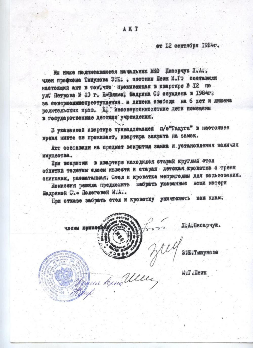 Акт обследования жилищных условий. В этом документе объясняется, почему нас отправили в детдом.