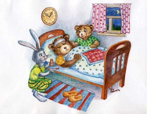 Как же я могу померить температуру, когда я цифр не знаю? А лекарства я нечаянно перепутал! Бабуля без очков не видит, очки куда-то подевались, а я-то читать не уме-е-е-ю-у-у! во всё горло заревел медвежонок.
