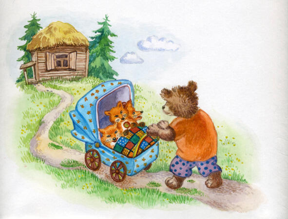 А в это время медвежонок Плюшка катил коляску к дому своего друга, зайца Изюмчика.