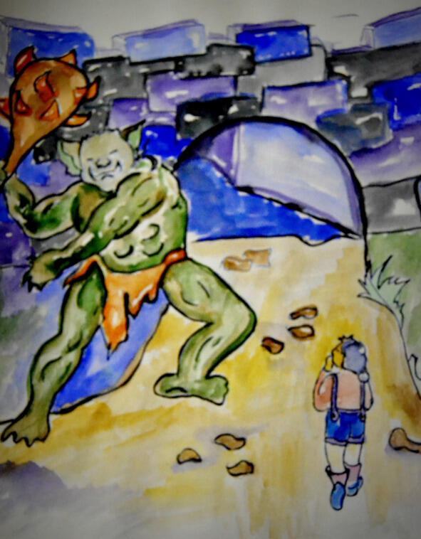 Маленький маг выбежал на узкую улочку, заваленную разломанными камнями и увидел на земле следы гигантских ступней. Это были следы тролля. Огромная тень нависла над магом он поднял голову вверх и увидел, как большой зеленый тролль прыгает со стены черного лабиринта. Он приземлился прямо перед магом и преградил ему путь. Глаза его горели двумя красными огоньками, а кожа огрубевшая и покрытая шрамами от сражения с другими троллями напоминала кору дерева. В руках он держал дубину с торчащими шипами. Маленький маг не растерялся и: