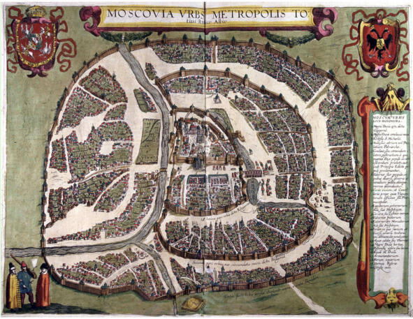 1. Sigismund Plan, 1610, vor der Zerstörung von 1612. Der Norden hier ist auf der rechten Seite. In der Kurve des Flusses Neglinka (dann konnte es einen wunderbaren Fisch fangen) der Kreml.