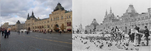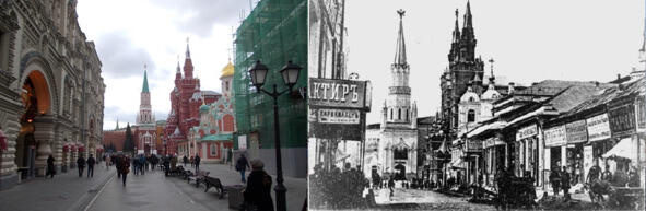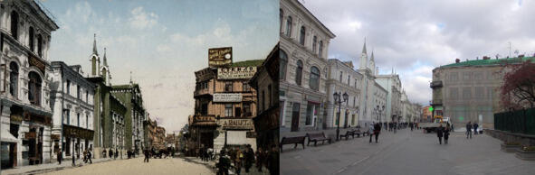 7. Straße Nikolskaja, im frühen zwanzigsten Jahrhundert, und jetzt. Die Richtung zum Lubjanka-Platz (das Gebäude der Staatssicherheitsorgane, Cheka-NKVD-KGB-FSB, sowie das Zentralkaufhaus Kinderwelt).