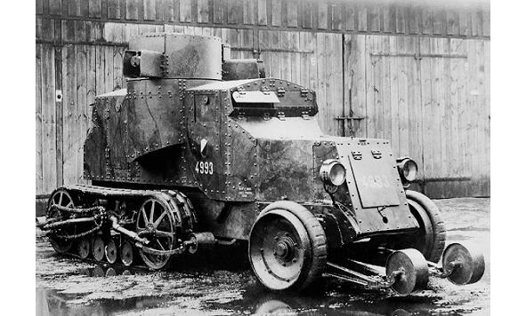 4. Caterpillar Panzerwagen Austin-Kegress, er, nach den Meinungen von durchaus kompetenten Zeitgenossen und leichten russischen Panzer. Gewicht 5,8 Tonnen, Besatzung 5 Personen, vertikale Buchung 8 mm., Dach 6 mm. Bewaffnung: zwei 7,62 mm. Maschinengewehr Maxim. Spezifische Leistung: 9 PS Die Geschwindigkeit entlang der Autobahn beträgt 25 km, die Reichweite beträgt 100 km. Bodendruck 0,3 kg. pro Quadratmeter siehe