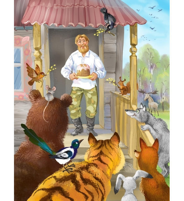 Будет тебе куличик! говорит батюшка. Пошёл в свою избушку и вынес большой румяный кулич, круглобокий да дивно пахнущий. Вот, раздай своим зверям, да и сам не забудь кусочек съесть!
