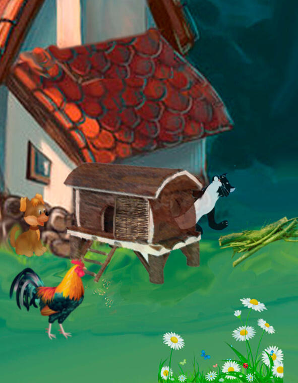 Возле дома росли одуванчики, ромашки и васильки. Бабочки порхали над лужайкой, собирая пыльцу с цветов. Птицы распевали свои мелодичные трели. Курочки с петушком целыми днями собирали зёрнышки. Петушок зёрнышко добывал и звал курочек отпробовать угощение.