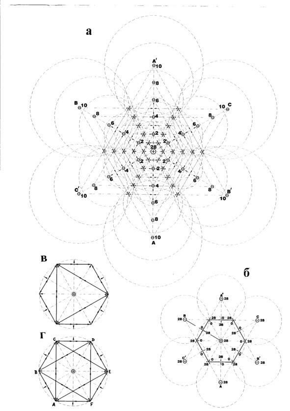 В момент достижения космической биполярной силовой системой Света статического равновесия проявление высшего энергетического Триединства находит свое отражение в определенном соотношении количественных показателей пяти составляющих. Наблюдается равенство потенциалов противодействующих сил в точках сопряжения 14 единицам, а величина отрицательного заряда и напряжения системы достигают величины наведенного положительного заряда в 28 условных единиц (рис. 4.а). Местоположение этих величин и всех промежуточных значений указанных характеристик в энергетическом треугольнике позволяет наглядно увидеть, что принцип поляризации двойственной силы Света обладает симметрией.