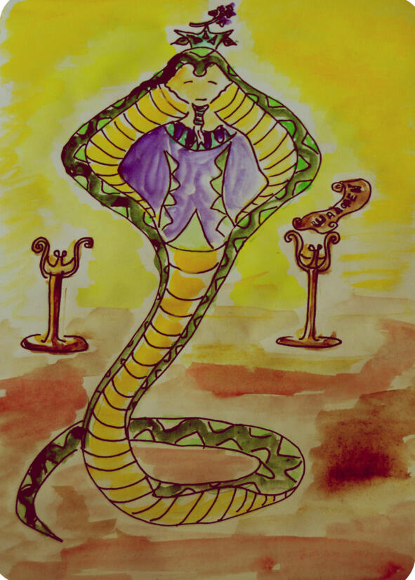 Выйдя из леса маленький маг оказался перед песчаной пустыней. Вдали возвышались башни королевства Наги. Этими землями правили змеи. Мудрые, но опасные они редко принимали чужаков в своих владениях, но у маленького мага не было выбора и он отправился в их королевство. Подойдя к главным воротам маленький маг заметил, что нет ни одного змея воина охранявшего замок, пройдя вдоль улиц и выйдя на центральную площадь он увидел длинный зеленый хвост торчащий из-за угла. Это был сам король Наги, он обходил владения и заметив маленького мага сильно удивился.
