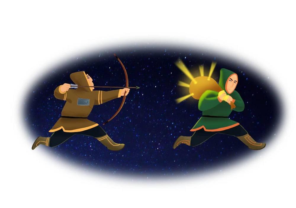 Богатырь сохатый Хоглен похитил на земле день и побежал с ним по небу. На земле стала ночь. Мани надел лыжи, взял добрый лук и две большие стрелы и пошел догонять Хоглена.