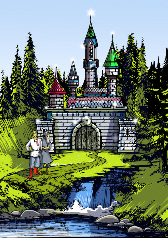 Он пошёл, не торопясь, опираясь на клюку. А юноша последовал за ним. Они вышли к красивому озеру с прозрачной водой. У озера стоял замок с башнями, украшенными изумрудами, которые сверкали и переливались на солнце. Башни замка венчали купола, осыпанные сапфирами и бриллиантами.