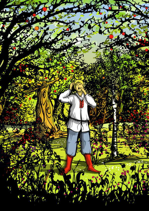 Долго шёл младший сын через поля, через луга, мимо реки. И дошёл он до леса. И привела его тропа на опушку. Проголодался младший сын. Видит, на полянке яблонька растёт. Попробовал он яблоки с этой яблони. Они сладкие, сочные, медовые. Так и тают во рту. Утолил он голод и дальше пошёл через лес по тропинке. Долго он шёл, опять есть захотел. Вспомнил он про дикую яблоню и пожалел, что яблок себе не нарвал на дорожку. Вдруг видит, перед ним груша стоит. Попробовал он груши жёлтые. А они сладкие, сочные, зернистые. Прямо слюни текут. Поел он. И дальше пошёл. Опять не нарвал фруктов на дорожку.