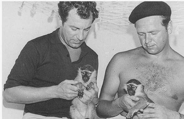 2-й помощник капитана Евгений Фёдоров и старпом Владимир Касаткин с Джулией и Джоном (зелёные мартышки).