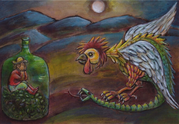 Тёмной ночью бледно мерцают его глаза, как звёзды Скорпиона. А на голове царственный огонь красного гребня. Издали видать. Кто знает, обойдёт дальней стороной. Но всегда есть безрассудные, что летят, как мотыльки, на Василисков костёр, который испепеляет. И в прах рассыпаются, шуршат песчинками под петушиными лапами.