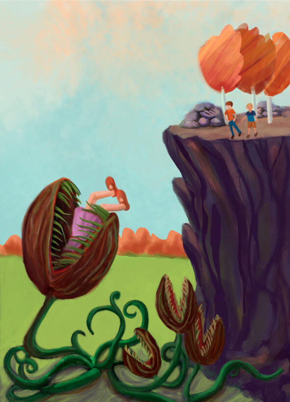 Что стоишь, как вкопанный? Испугался что ли? перебил мои мысли Витька. Давай лети! и, видимо от избытка чувств, он столкнул меня с высокой горы. От неожиданности из моей груди вырвался крик: «Ааааааааааааааааа!». Высота была поистине велика, поэтому, пролетая над землёй на ненадёжной верёвке, в моей голове возникли печальные образы последних мгновений моей недолгой жизни. «Нет!» сказал я себе, «Я должен быть благородным, я должен быть сильным и смелым». Именно этому учил меня Кирилл Соколов. Как можно шире я раскрыл глаза и увидел брыкающиеся ноги в пасти у плотоядного цветка. На лету я ухватился за ногу и вытащил её из крепкого бутона. Верёвка стала возвращать меня обратно к обрыву, как настоящий маятник. Я крикнул изо всех сил: «Витька, тяни верёвку назад!», не успев рассмотреть того, кто находился в моих руках. Когда мой друг стал наматывать верёвку на скалу, как на крюк, я перевёл взгляд на спасённое мною существо.