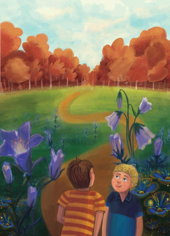 Трудно сказать, на что была похожа эта страна. Здесь перемешалось волшебство с реальным миром. Мы отряхнулись и покружились вокруг себя, оглядываясь вокруг. Наши грязные ботинки топтались по зелёной поляне, где красовались огромные нарисованные цветы. Все лепестки их были плоские, колыхающиеся в разные стороны от дуновения лёгкого ветерка. В воздухе стоял запах весенней капели, ласковых солнечных лучей и нежных весёлых ландышей. Мы услышали несколько нот звенящих колокольчиков, которые заигрывали с нами своей непревзойдённой леденящей красотой. На поляне не было зелёной травы, скорее это напоминало мягкий батут с ковровой дорожкой. Я сделал несколько шагов и отпружинил от колыхающейся поверхности. Необыкновенную поляну окружали плоские бумажные деревья, их ветви загибались под тяжестью воздуха, а листва походила на разноцветные картинки. К каждой ветке были прикреплены атласные ленты алого цвета. Этот мир был создан в ярких красках зелёная земля, жёлто-сине-розовые цветы, красно-белые деревья, только небо было обычным, таким же голубым, как и на нашей планете Земля. Мы с Витькой засомневались, что находимся именно в книге. Возможно, это действительно была другая планета, например, Марс или Уран.