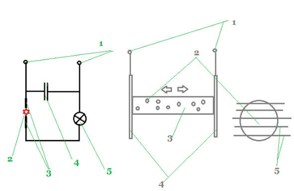 Figure on the left, the resonator of Chernetsky. 1. Power from a high voltage transformer, pulsating current. 2. Spark spark 3. Electrodes. 4. Condenser. 5. Active load, incandescent lamp. Picture on the right. A metal laser. An extended electrical circuit. 1. Nutrition. 2. Areas in the working body of the laser, lattice sites or domains having the same spectrum. 3. The conductor as the working body of a metallic laser. 4. Condenser plates like laser mirrors. 5. Schematic representation of the energy levels of interacting particles.