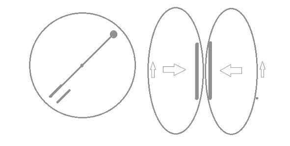 Left torsion balance, top view. Two plates parallel to each other (below), reduced to a distance of less than 45 cm, begin to experience mutual attraction. On the right two plates, a tube, any surfaces forming a narrow (yes, there is such a term) generate an uninterrupted (pulsing) vortex.