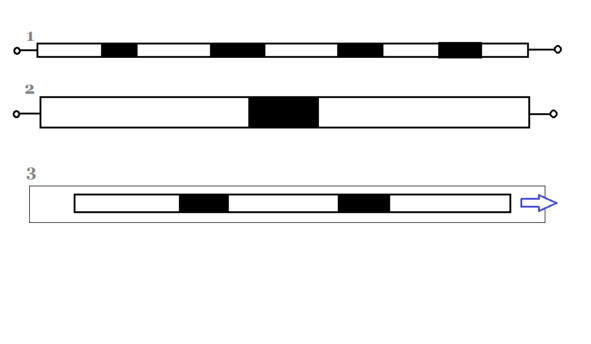 1. A nickel or nichrome spiral, when a current of 11.5 A passes through it, at a voltage of 140 V, reveals local heating zones. Presumably, these are areas of internal separation, inherent in any (as it is isolated from the environment) physical body. 2. Gutter with a conductive mass of wet sand. The capacity is divided in two by the central zone of increased heating. 3. The galvanized plate in a solution of hydrochloric acid is divided into segments. The presence in the acid stream (as an option) shows the zones of increased oxidation faster, but does not change the overall picture.