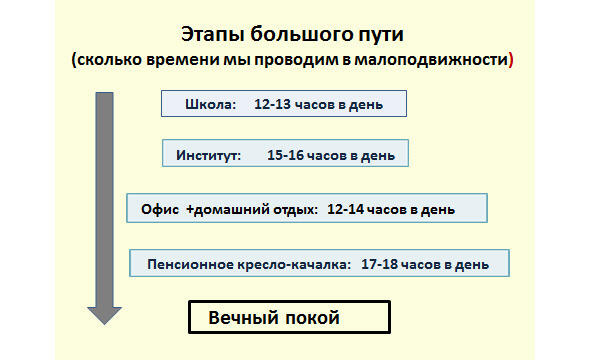 Вся дальнейшая сидячая жизнь уже расписана на годы вперед и, если не предпринимать героических усилий, неизбежно влечет за собой развитие хронических дегенеративных болезней и преждевременную смерть.