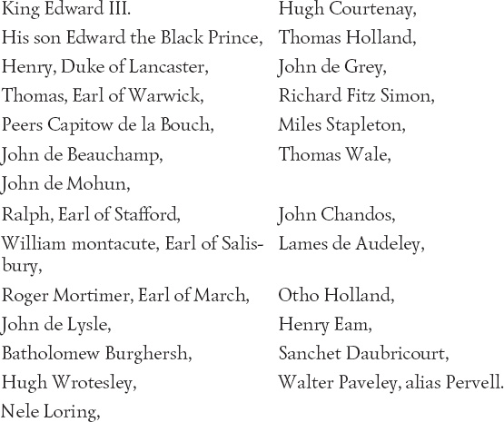 I might go back here to the history of the Order of the Garter, the institution of which by King Edward III. not only had its original here, but seems to be seated here, as a native of the place; and that this is the place where the ceremonies of it, the instalments, feasts, &c. are always to be performed: But this is done so fully in other authors, and by so many, that it would be falling into that error, which I condemn in others, and making my accounts be, what I resolved, from the beginning, they should not be; namely, A copy of other mens performances. I shall only give you out of Mr. Ashmole, a list of the first knights who had the honour of this Order, and who have been succeeded by so many kings, dukes, and sovereign princes abroad, as well as noble-men, and peers of this kingdom at home. The names of the first knights are as follow.
