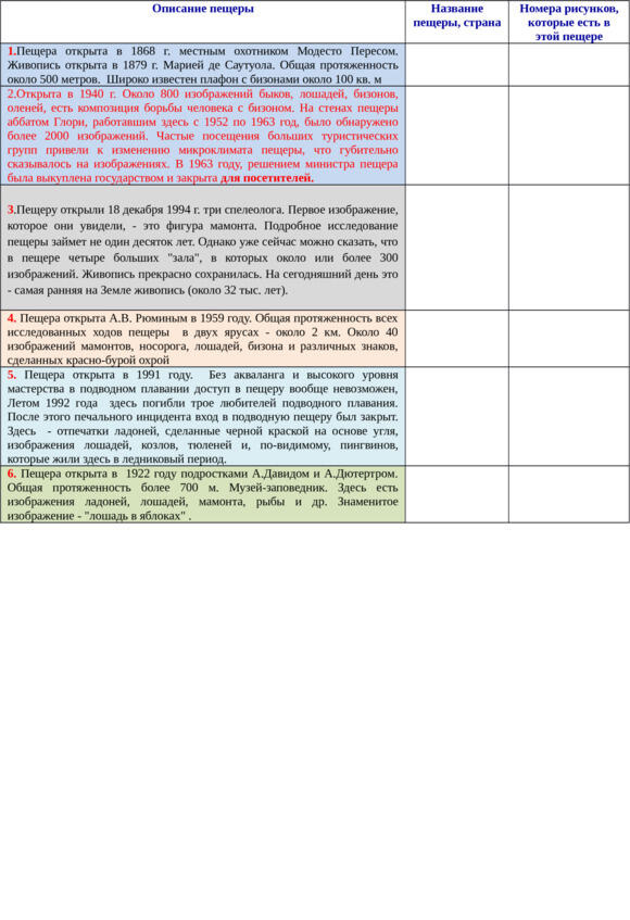 1. Как вам уже известно, среди множества пещер, в которых обнаружена палеолитическая живопись, есть несколько самых известных: Альтамира,Ляско, Шове, Коске, Капова, Пеш-Мерль. Вам предлагается по описанию определить, о какой пещере идёт речь, в какой стране она находится, какие рисунки есть в этой пещере (записать в таблицу номера этих рисунков).