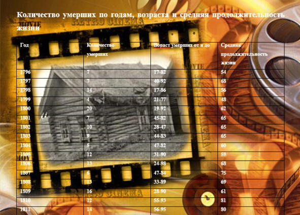 Согласно записям в ревизской сказке, я составила таблицу с помощью которой определила среднюю продолжительность жизни, количество умерших по годам, возраст самого молодого и пожилого из почивших (см. фото 2).