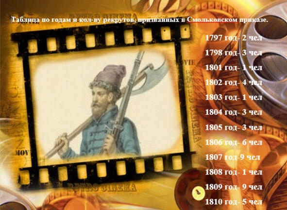 Среди отданных в рекруты из деревень Смольковского приказа с 1783 по 1811 годы встретились мужчины от 26 до 43 лет. В среднем по статистике России начала 19 века призывной возраст 2030 лет, однако по изученному материалу, он выше среднего. Так же существуют данные, что в рекруты брали примерно 1 мужчину из 100.