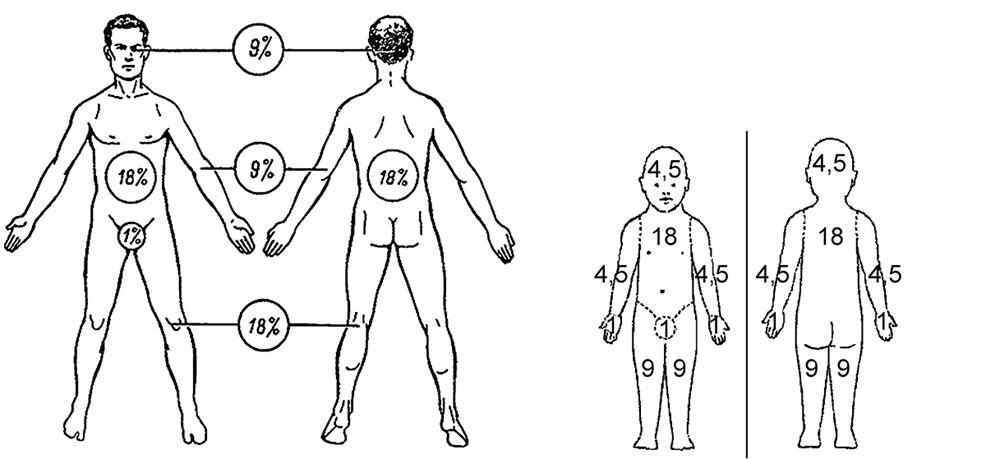 Для розрахунку площі опіку застосовують спосіб під назвою «правило 9 (Уоллеса)»