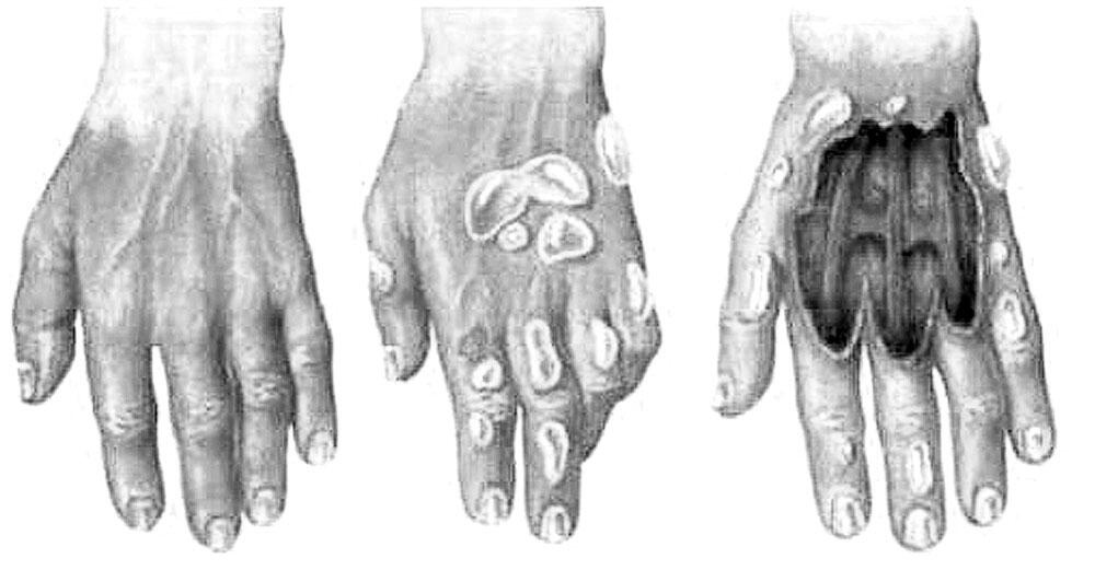 Місцями зявляться чорний некроз або пухирі, що містять кров.