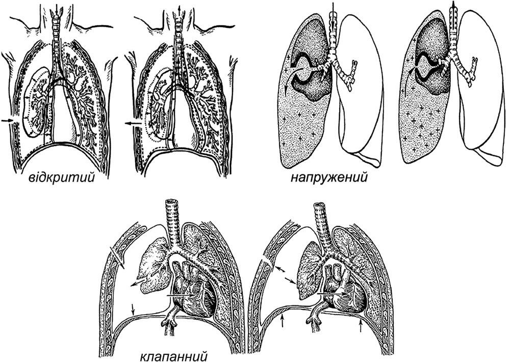 клапанний: повітря в момент вдоху надходить у плевральну порожнину, а при видиху через зсув тканин у рані та її закриття не виходить назовні. При цьому виникає напружений пневмоторакс, який призводить до здавлювання судин і серця.