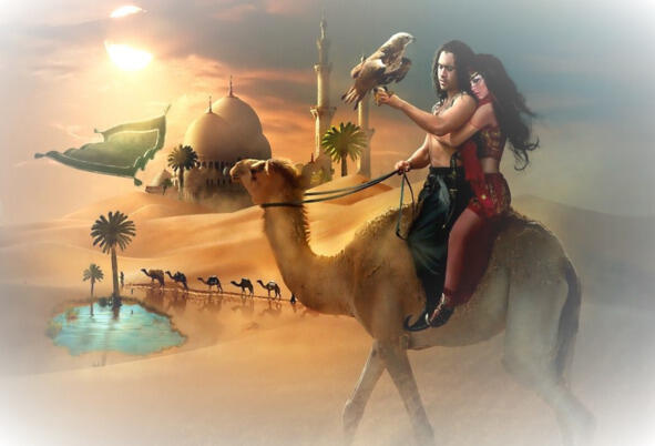 В соседнем городе жил молодой купец, Арслан, путешествующий со своим караваном от великих песков до высоких гор, от синих морей до бескрайних степей. У него был волшебный верблюд. Он мог за мгновение перенести своего хозяина к морю или на базар, а ещё он нередко спасал его от разбойников.